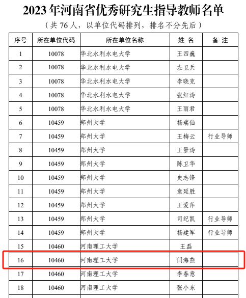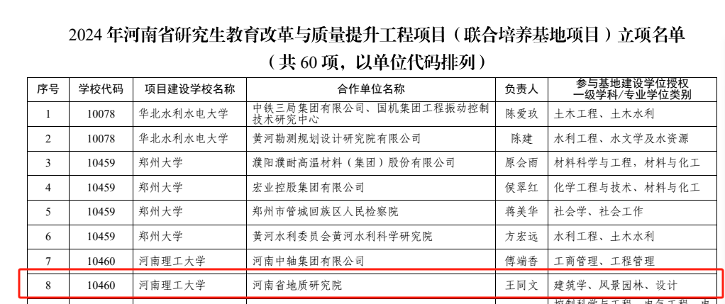 近日,河南省教育厅下发了《关于公布2024年河南省研究生教育改革与质量提升工程项目立项名单的通知》(教研〔2023〕436号)和《关于公布2023年河南省研究生教育先进团队和个人评选结果的通知》(教研〔2023〕438号),学院院长王同文负责的学院与河南省地质院研究生联合培养基地项目获批、闫海燕教授荣获省级优秀研究生指导教师荣誉称号。