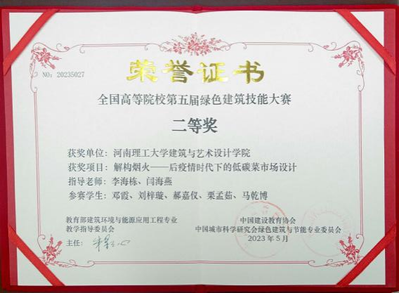 近日,由教育部建筑环境与能源应用工程专业教学指导委员会指导、中国建设教育协会与中国城市科学研究会绿色建筑与节能专业委员会联合主办的“第五届全国高等院校绿色建筑设计技能大赛”获奖结果揭晓。河南理工大学建筑与艺术设计学院设计作品荣获二等奖1项、三等奖1项、优秀作品奖5项,闫海燕和李海栋老师获优秀指导老师奖,学院获院校组织奖。