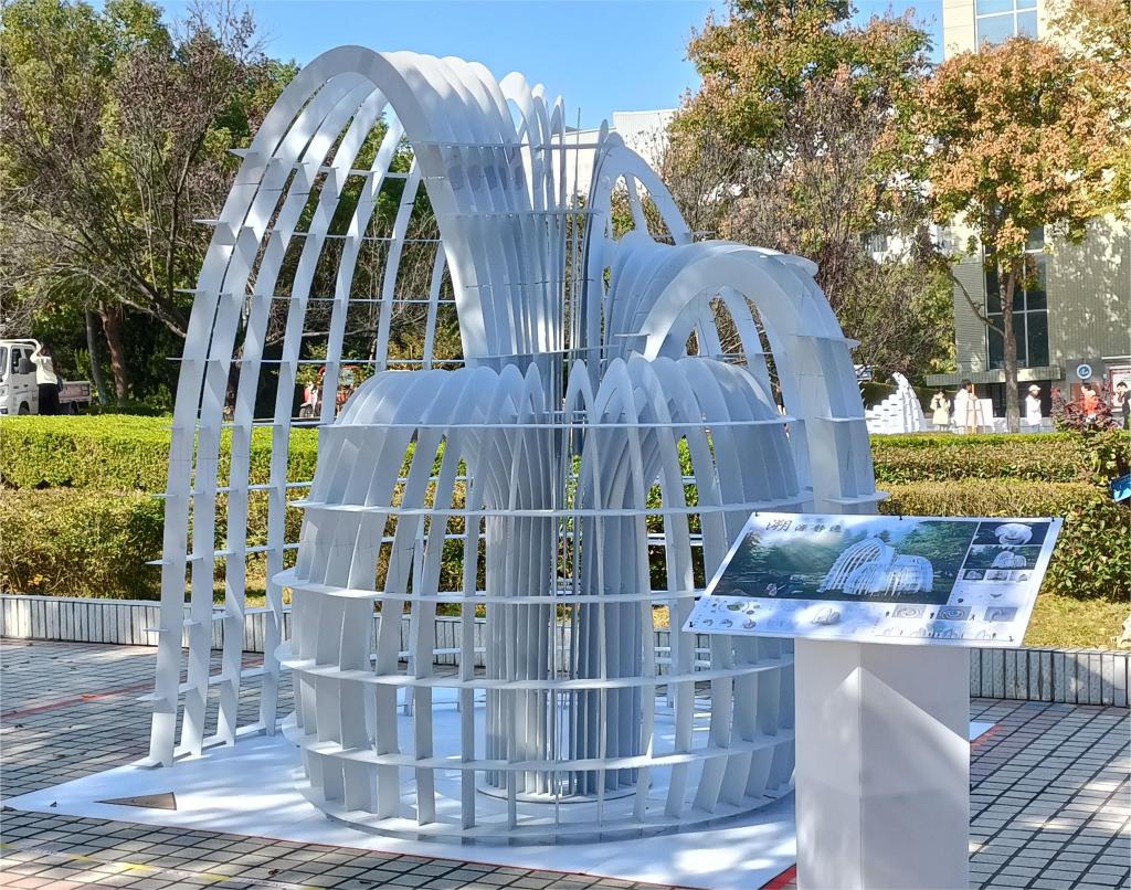 本次大赛以“原·巢”为主题,旨在营建一片能遮风挡雨的屋顶,可抵御自然变化对自身的影响,满足生命安全感和生活舒适感。参赛队员以白色“中空板”为材料进行实体搭建,需要在规定时间和空间内完成作品,充分考验了参赛选手的专业水平、动手能力、创新思维和团队协作能力。建艺学院“春风有聚”队设计建造的《溯源静逸》作品获得一等奖。该作品由毕小芳、刘聪玲老师指导,作品表达了人类追溯往昔、立足当下、无愧未来的情怀。该作品因其宏大、新颖的立意,获得了多位专家教授的认可,在答辩环节中更是表现优秀,在多组参赛作品中脱颖而出。“秋水相逢”队设计建造的《第二自然》获得三等奖,该作品由李海栋、庄昭奎老师指导。