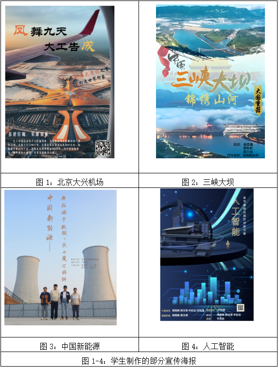 本门课程的过程考核方式在体现课程思政元素的基础上尽可能吸引学生的兴趣,发挥学生的特长。该课程的过程作业根据学生的兴趣为四选一,分别是视频制作、科技论文撰写和工程项目图纸绘制以及调研报告撰写,每年的过程考核方式会有所调整。以中国知名基础设施介绍为例,学生以老师提供的中国知名基础设施或学生自己感兴趣的中国知名基础设施为目标,例如南水北调工程、西气东输工程、三峡大坝工程、中国特高压工程、小浪底工程等来进行短视频制作。本作业的主要目的在于加强学生的专项训练,使学生树立融贯综合以及广义基础设施规划的意识,培养学生对于热点的关注,增强家国情怀,树立民族自信心。同学们结合时代热点搜集资料,分组完成一个宣传视频,并制作一份宣传海报(见图1-4)。