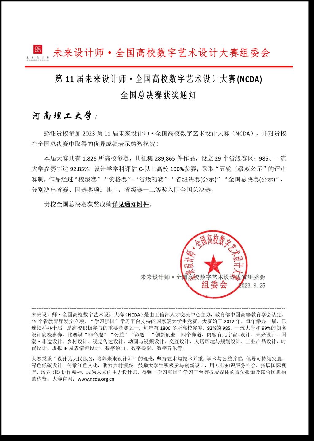 未来设计师·全国高校数字艺术设计大赛(NCDA)是由工信部人才交流中心主办,教育部中国高等教育学会认定的国家级大学生竞赛。该设计大赛起始于2007年,到目前为止已经连续举办17届,是我国第一个以数字艺术为核心,在艺术设计、数字媒体、数字技术等专业领域里的综合性赛事,也是中国高等教育学会《全国普通高校学科竞赛排行榜》中重要的国家级学科竞赛。