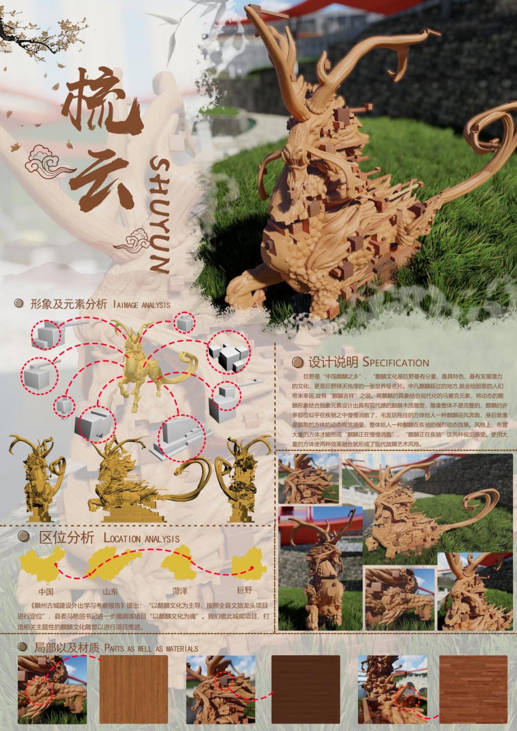 樊泽鑫等三位同学的作品“沁古叠今——集璞舍”获得国赛二等奖,该作品基于韧性视角的乡村更新设计,以武陟县中封村文旅产业发展为例,以“璞”为主题,构建东方院落、寂隐生活。以“花生之乡,文化旅居”为核心,以宅院的形制,构建小亭与院落,顺应当下的生活方式,从衣食住行的生活方式中探寻文化旅居更多的可能性,结合当地民族文化实现韵味提升,在打造新旧融合的过程中保留本土韵味。