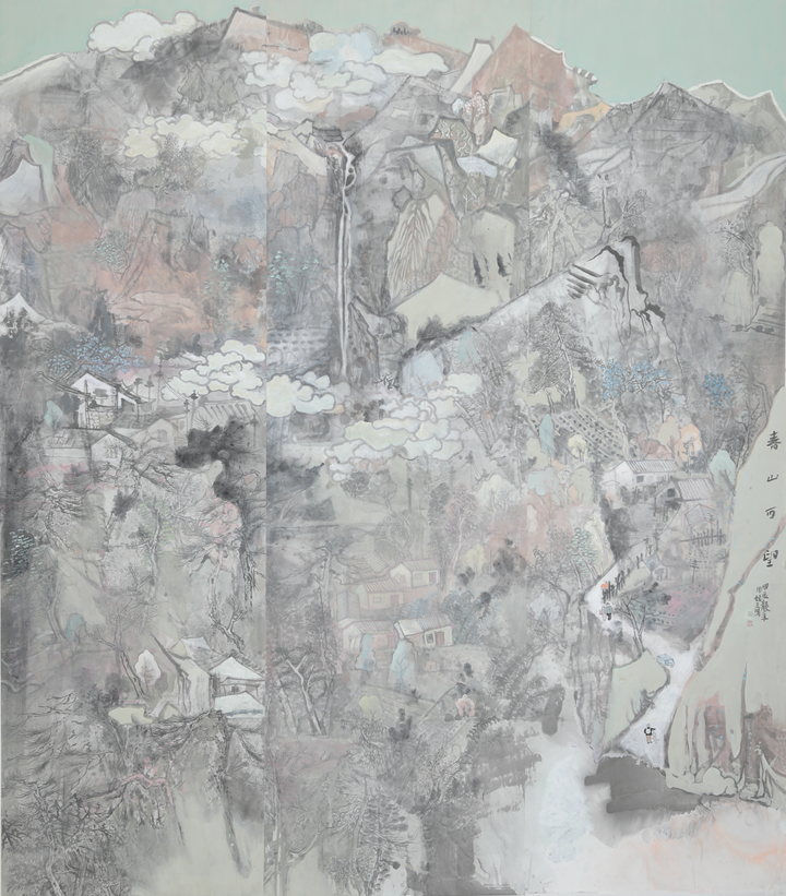 《春山可望》以春山和希望为题展开创作,利用宋元技法来接近入古出新的画题尝试。画中所绘春山云雾、民居屋瓦、山林瀑布,都是对太行山麓家乡山水的记录与诗意描绘,力图在古法之外寻求对祖国大好河山的全面感受,达到素以为绚的适然,进一步助力新时代中国特色社会主义文化建设。