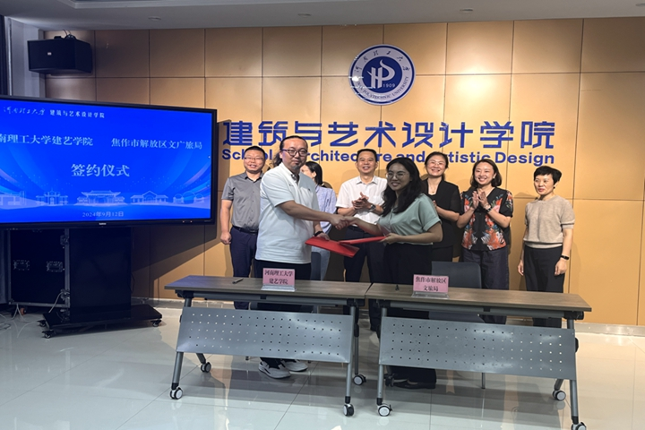为进一步加强校地合作、促进产教学研融合,9月12日上午,建筑与艺术设计学院与焦作市解放区文化广电和旅游局交流座谈会暨“产教学创研”立体化实践平台建设签约仪式在建艺学院会议室举行。解放区文广旅局党组书记和毅、副局长张倩、旅游发展服务中心主任赵利利、解放文化旅游发展投资有限责任公司董事长冯伊敏,该院领导班子成员,教师代表等出席座谈会。座谈会由学院副院长韩宏斌主持。
