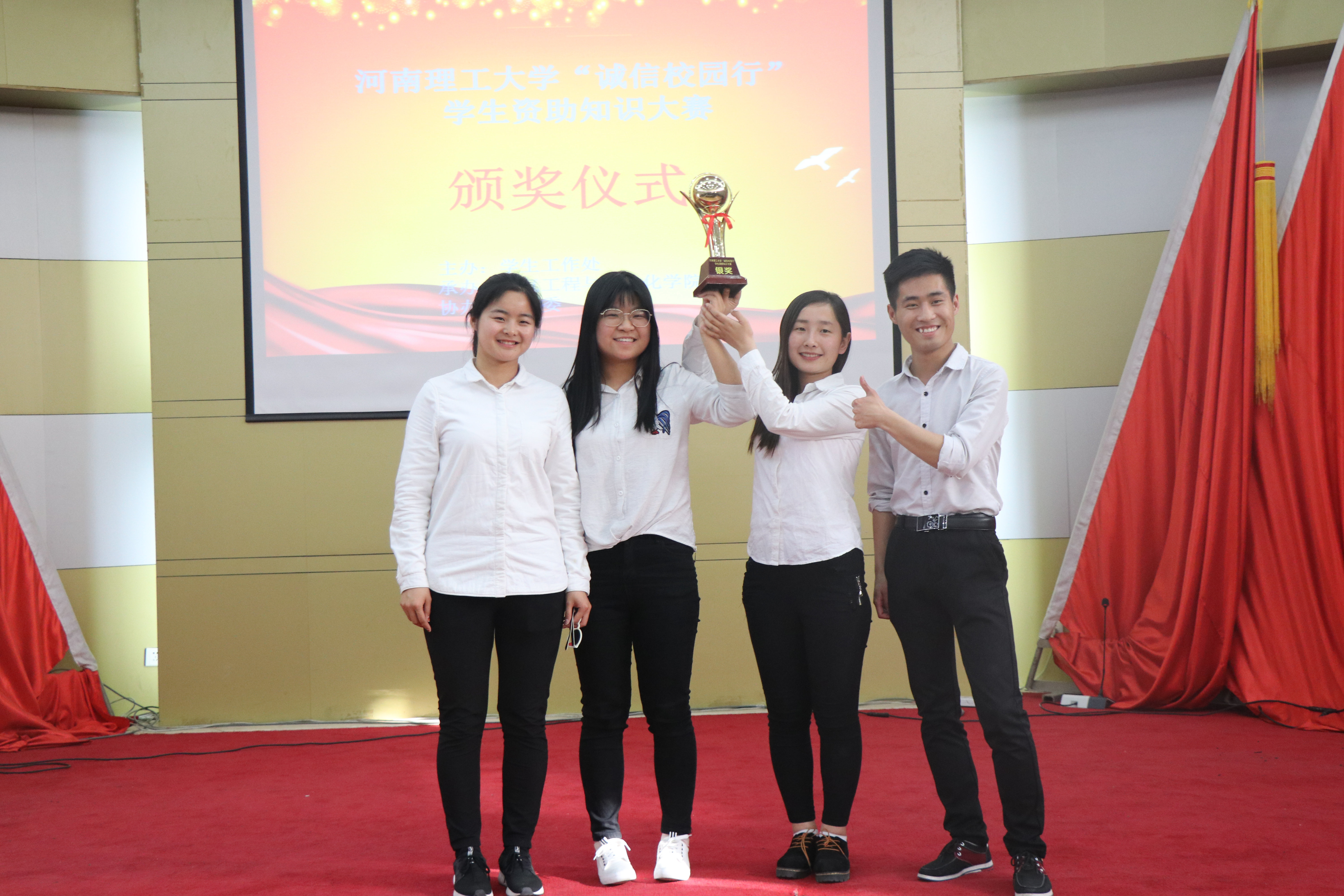 为了宣传、普及国奖助学政策知识,加强高校学生诚信教育,4月1日,我校“诚信校园行”学生资助大赛决赛在力行楼圆形报告厅成功举行。我院15级学生王艳萍、葛旭雷、朱孟华、王晓燕4名同学代表学院在复赛中20进6,并于决赛中斩获银奖。
