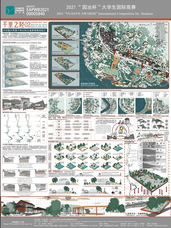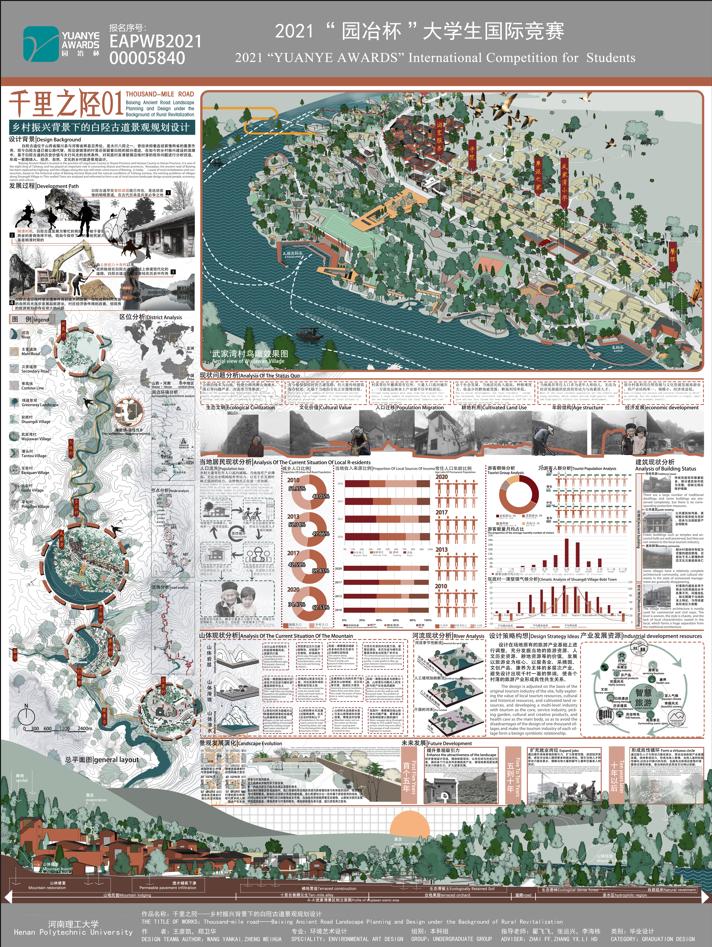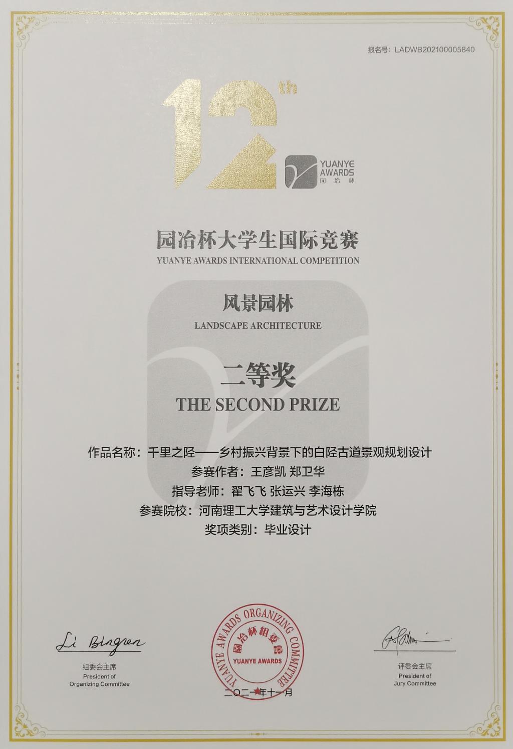 近日,由园冶杯国际竞赛组委会、国际生态景观协会联合主办的第十二届“园冶杯”大学生国际竞赛获奖名单公布,由我校建筑与艺术学院专业教师翟飞飞、张运兴和李海栋共同指导的2021届本科毕业生王彦凯、郑卫华作品《千里之陉——乡村振兴背景下的白陉古道景观规划设计》荣获毕业设计类二等奖,实现学院在该赛事等级奖的突破。建艺学院荣获优秀组织奖和先进教育集体奖,王维天老师荣获优秀联络员奖。