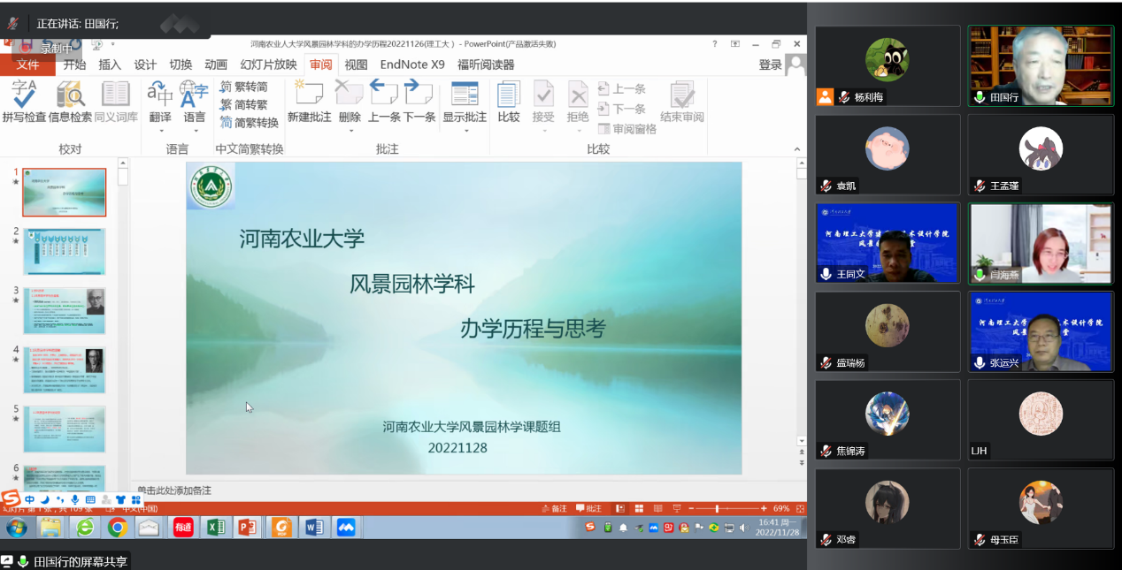11月28日下午,由学院主办的“风景园林大讲堂”在腾讯会议顺利召开。学院特邀河南农业大学风景园林与艺术学院院长田国行教授作了题为《风景园林学科办学历程与思考》的专题报告。报告由学院院长王同文主持。