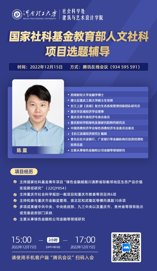 为进一步提高我校国家社科基金申报质量,切实提升学院教师科研能力,按照《河南理工大学2023年度国家社科基金/教育部人文社科项目申报工作方案》安排,2022年12月15日15时,由河南理工大学社科处主办、建筑与艺术设计学院牵头,邀请重庆工商大学陈震教授作了题为《国家社科基金/教育部人文社科项目选题辅导》的专题讲座,并对学院预申报项目进行了较为详细深入的论证。会议由副院长韩宏斌主持,我校社科处处长张合兵和90余教师通过腾讯会议的形式在线参加。