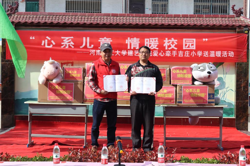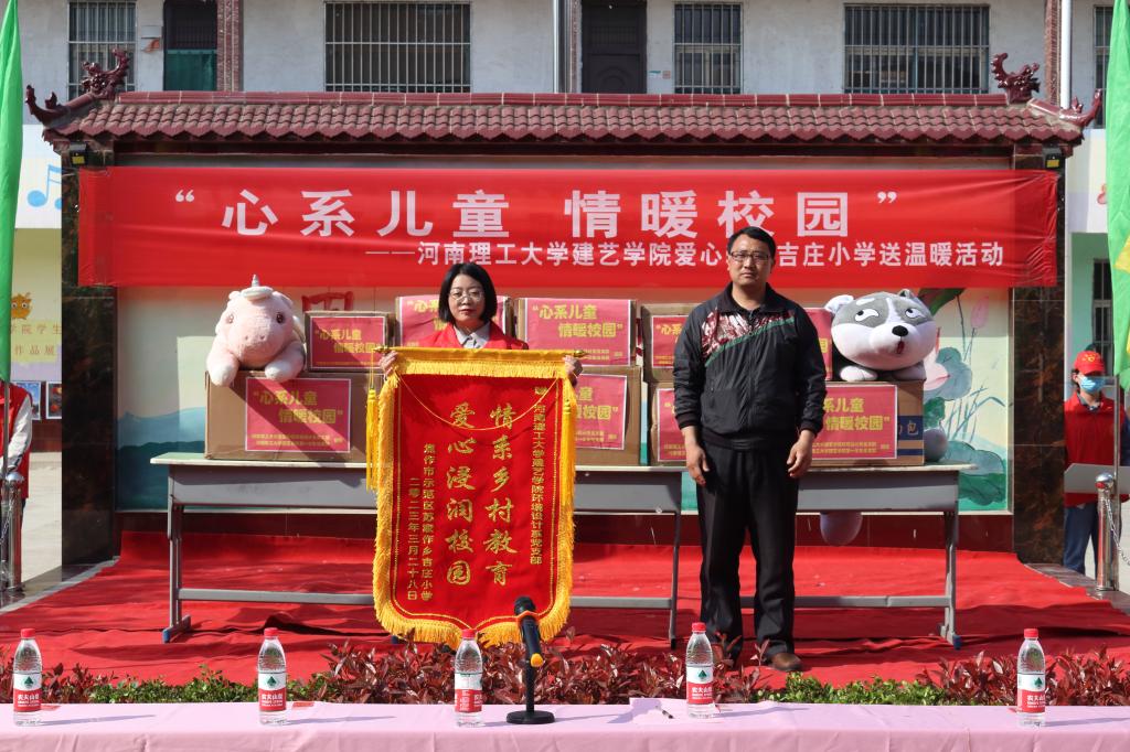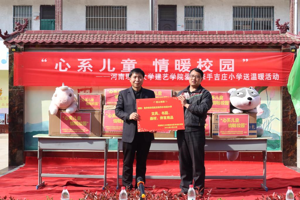 活动伊始,吉庄小学刘三平校长对河南理工大学建筑与艺术设计学院师生的到来表示热烈欢迎。学院党委副书记张明为本次爱心活动致词,并代表学院向吉庄小学捐赠爱心物资。为表示感谢,吉庄小学校长代表全体师生向我院回赠锦旗。为进一步完善吉庄小学音体美方面的教学力量,双方共同签订爱心帮扶证书,共建爱心帮扶基地。随后,张明书记与吉庄小学师生们一同参观我院本科生优秀作品展。最后,19名志愿者进班级为小学生们开展丰富多彩的艺术教学活动,有手工制作、艺术绘画、科学普及和非物质文化遗产“当阳峪绞胎瓷”等内容。通过本次爱心帮扶,我院师生不仅带去了文具、书籍、体育用品等物资,还带给了孩子们别开生面的艺术课堂,进一步补充该校教学用具,丰富教学环境,陶冶学生情操,开阔学生视野。通过这种寓教于乐的教学方式,让师生们感受到五彩缤纷的美育学习乐趣。
