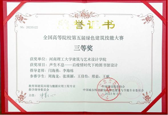 近日,由教育部建筑环境与能源应用工程专业教学指导委员会指导、中国建设教育协会与中国城市科学研究会绿色建筑与节能专业委员会联合主办的“第五届全国高等院校绿色建筑设计技能大赛”获奖结果揭晓。河南理工大学建筑与艺术设计学院设计作品荣获二等奖1项、三等奖1项、优秀作品奖5项,闫海燕和李海栋老师获优秀指导老师奖,学院获院校组织奖。