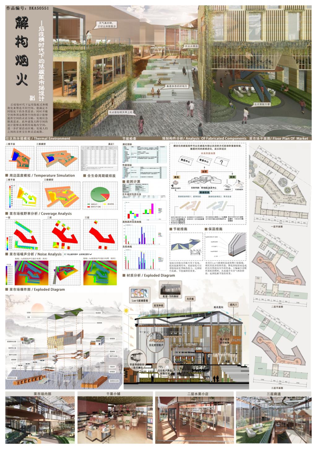 解构烟火(二等奖):基地位于河南省济源市济水大街与荆梁路交叉口附近,本项目在农贸市场原址上进行菜市场的设计与建造。设计整体分为三个部分,北侧建筑-中间菜市场主体建筑-南侧建筑,三个部分通过空中廊道串联为一个有机整体。项目采用雨水收集、太阳能板、屋顶绿化、装配式结构等多种节能减碳措施,打造了一个集休闲、娱乐、采买为一体的社区共享空间。同时,建筑通过装配式空间也增加菜市场功能的多元性和灵活性。