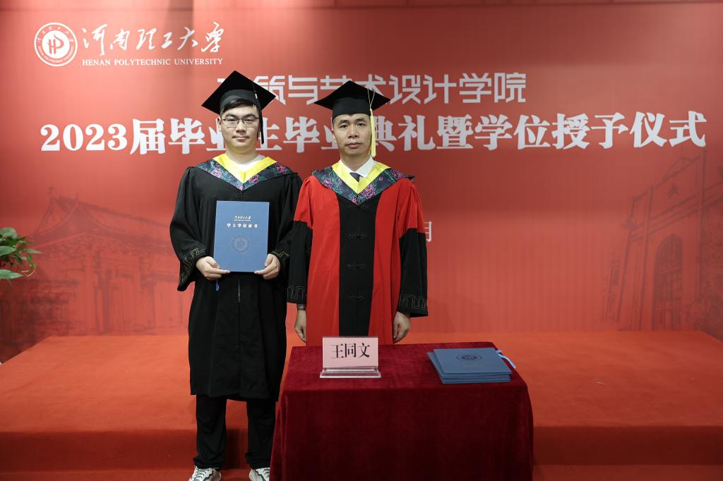 仪式伊始,由学院领导为毕业生代表发放毕业纪念品,为广大毕业生送去了母校的关心和祝福。随后,王同文向毕业生致辞寄语,他讲到“你们是心中有火,眼里有光的的后生,没有辜负老师和家长的期望,祝大家毕业快乐”。同时,向毕业生们提出了四点希望,希望大家“努力做胸怀家国的奋斗者,做立德修身的坚守者,做追求卓越的开拓者和民族复兴的圆梦者。最后,王同文、张建新、张明、韩宏斌和闫海燕分别为学院全体2023届本硕毕业生授予学位并进行拨穗留念