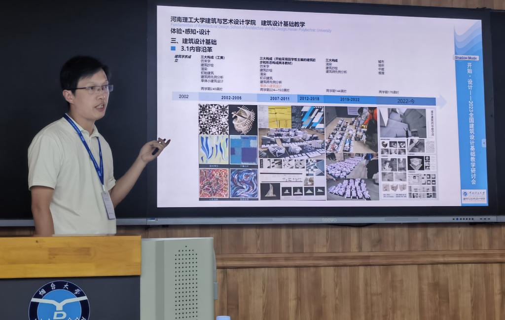 学院冯涛、李楠、周媛媛三位教师参会,李楠老师做“体验·感知·设计——河南理工大学建筑与艺术设计学院建筑设计基础教学实践”的教学汇报,从形式语言训练与体验设计训练比较,简述了建筑设计基础教学在理念、内容、方式等方面的转变,并介绍了学院建筑教育发展沿革及建筑设计基础课程的设置与安排。