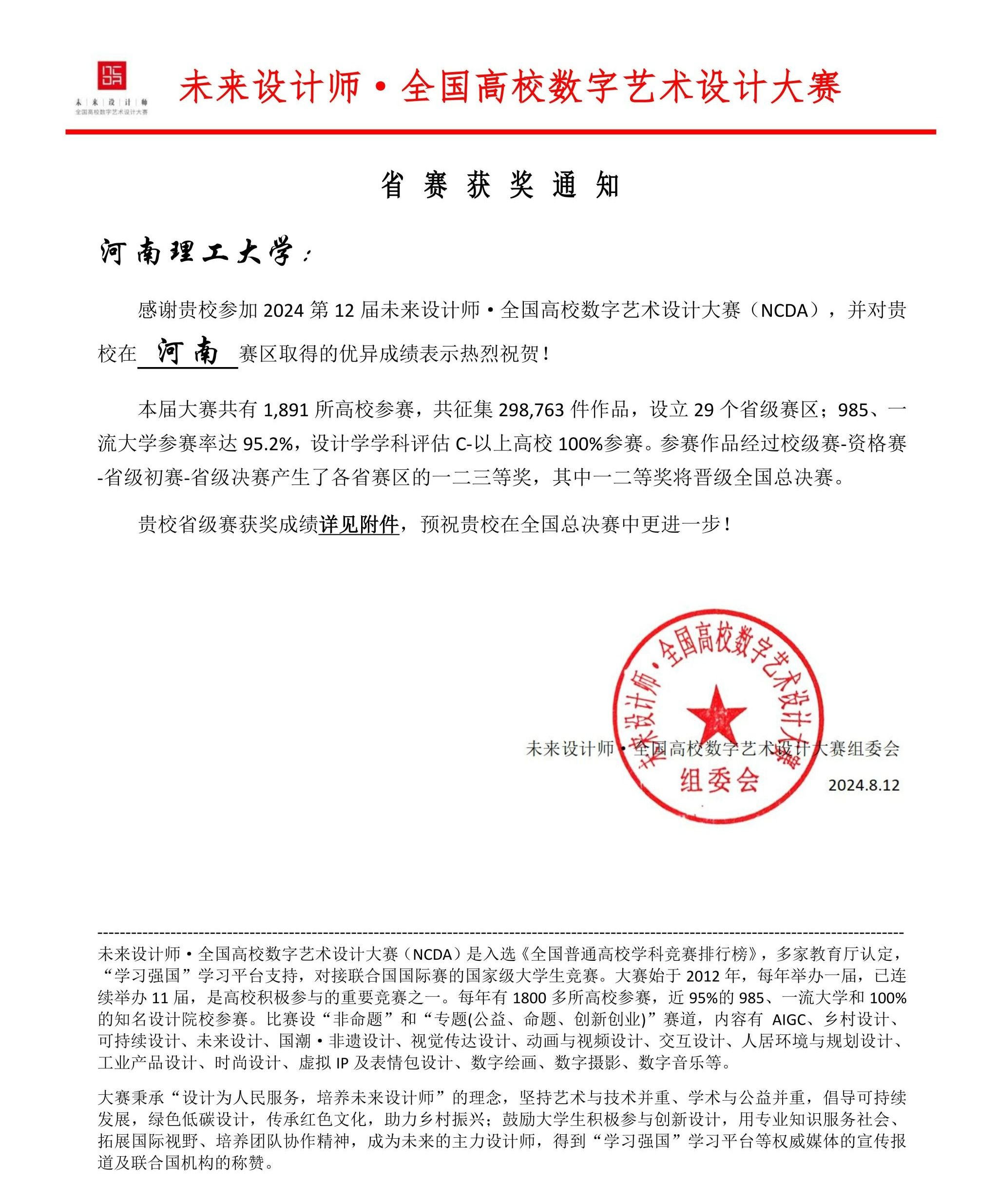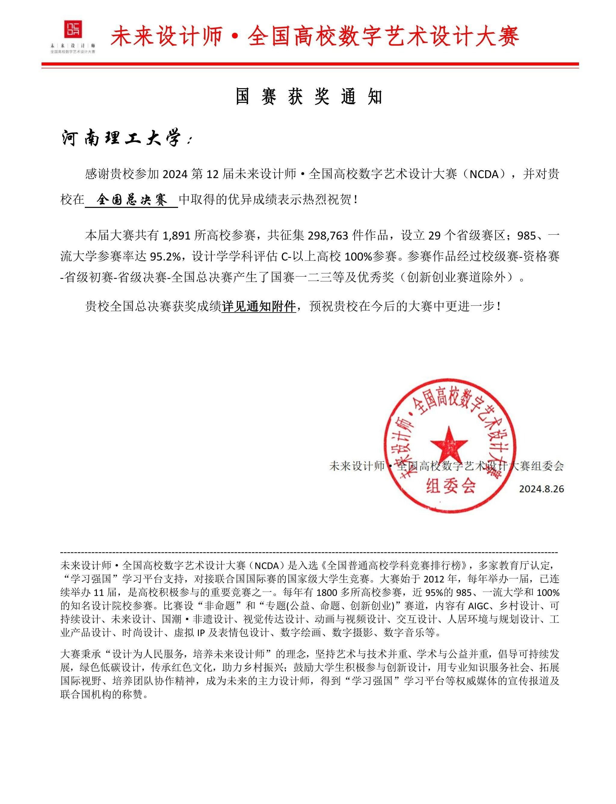 2024年第十二届未来设计师·全国高校数字艺术设计大赛(NCDA)成绩近日公布。该赛事由工信部人才交流中心主办,已纳入中国高等教育学会发布的《全国普通高校学科竞赛排行榜》,“学习强国”平台支持,对接联合国国际赛的国家级大学生竞赛。本届大赛共有1891所高校参赛,共收到298763件作品,设立29个省级赛区;985、一流大学参赛率达95.2%,设计学学科评估C-以上高校100%参赛;参赛作品经过校级赛-资格赛-省级初赛-省级决赛-全国总决赛多轮竞赛,分别产生省级赛和全国赛获奖作品。
