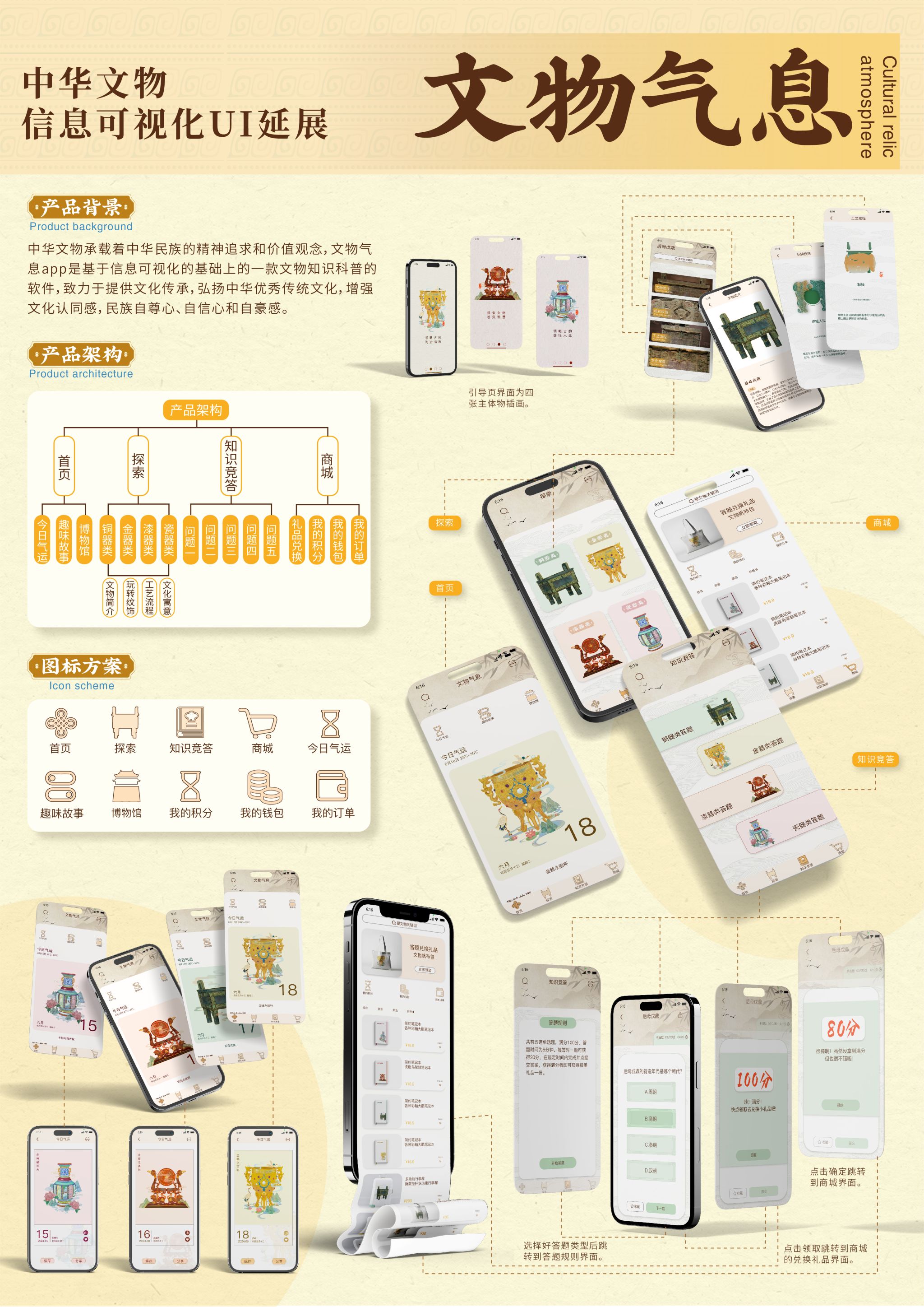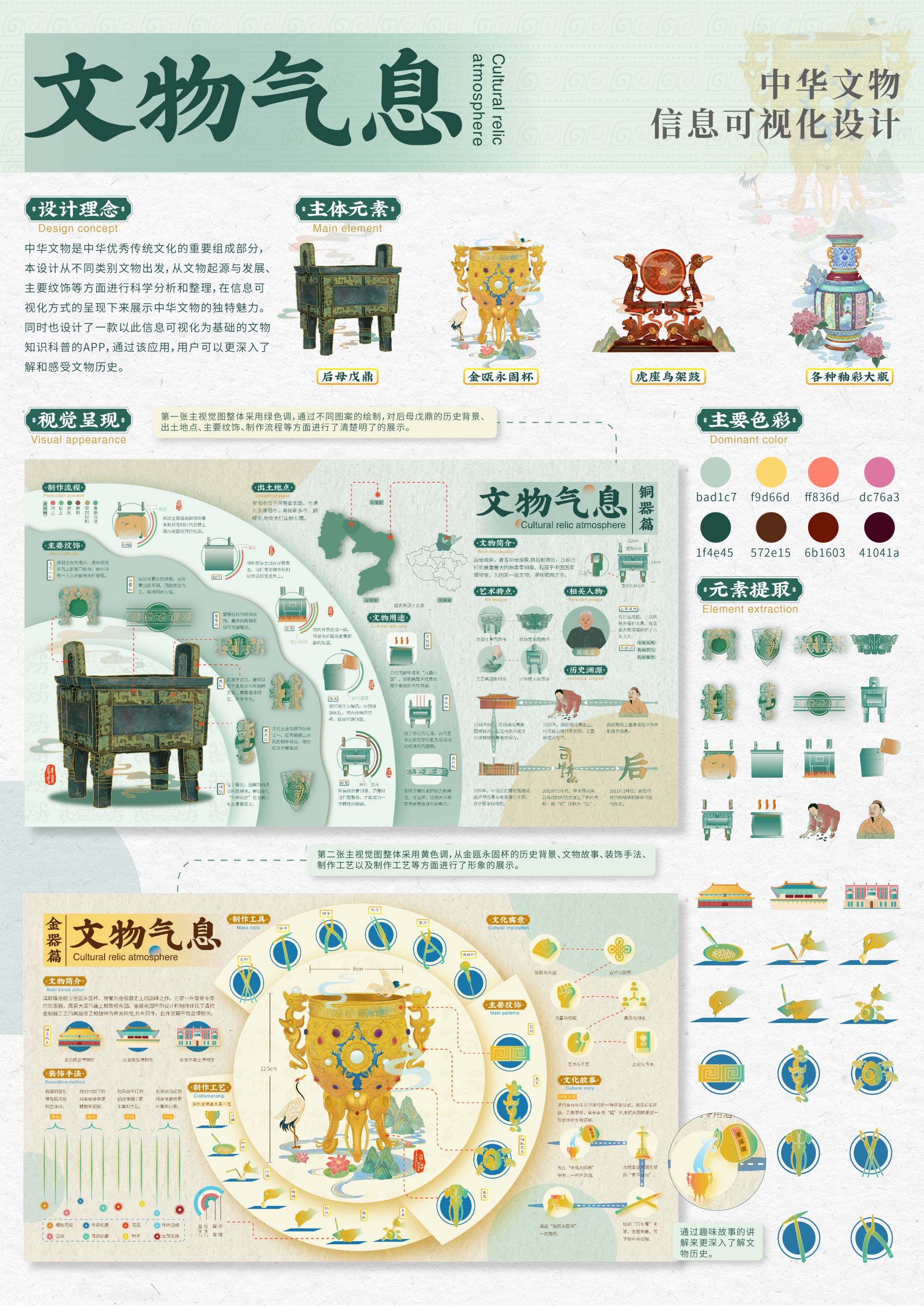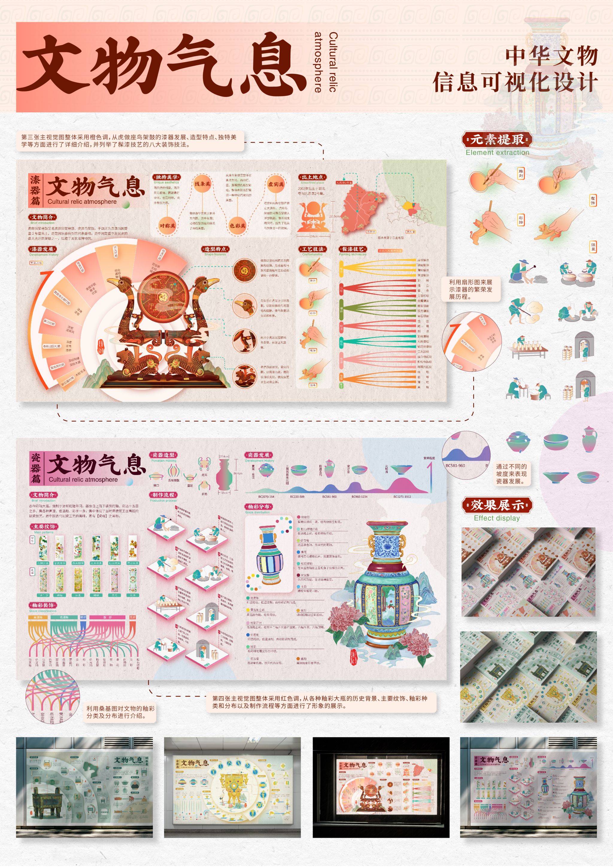 在本届大赛中,建艺学院师生荣获包括国赛优秀指导教师奖、空间设计类二等奖、视觉传达类一等奖等多项荣誉。其中,王璐、薛曼君和徐海涛获得国赛优秀指导教师奖。在国赛普通高等院校赛道中,吴仔佳同学的《中华文物信息设计》获得视觉传达类一等奖,该设计以信息可视化的方式,深入展示中华文物的独特魅力,让观众快速直观地了解中国传统文化;李晓静同学的《夔-安阳市商场设计》获得空间设计类二等奖,作品巧妙融合当地青铜文化,以夔龙纹的“流动”为核心,打造一个多功能商场建筑。同时,在河南分赛区,李晓静和陈烁宇同学的《归园慢漫,悠见太行》荣获空间设计类二等奖;林姝洋和余子仪同学的《红军长征》获得红色主题类二等奖;李芷涵、李晓静、张笑笑同学的《回旋之间,别有洞天》获得空间设计类优秀奖。