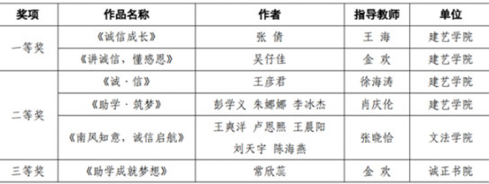 2024年,我院积极参与2023-2024学年度河南省“诚信校园行”学生资助公益广告设计大赛,本次大赛以“树诚信自强风,做励志感恩人”为主题,前后历时6个月。经最终评审,学院推选作品《诚信成长》《讲诚信,懂感恩》2件作品荣获省级一等奖,《诚·信》《助学·筑梦》2件作品荣获省级二等奖。