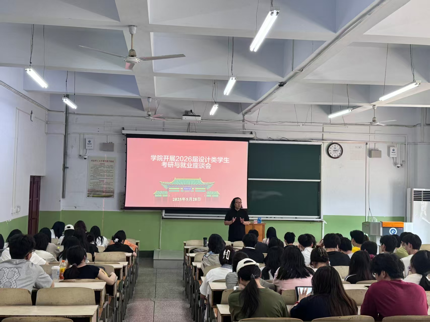 为帮助学生更好地了解考研和就业形势,明确未来发展方向,5月28日下午,我院在2101教室开展2026届设计类专业考研、就业座谈会。座谈会由学院副院长韩宏斌主持,2022级设计类专业近百名同学参加。