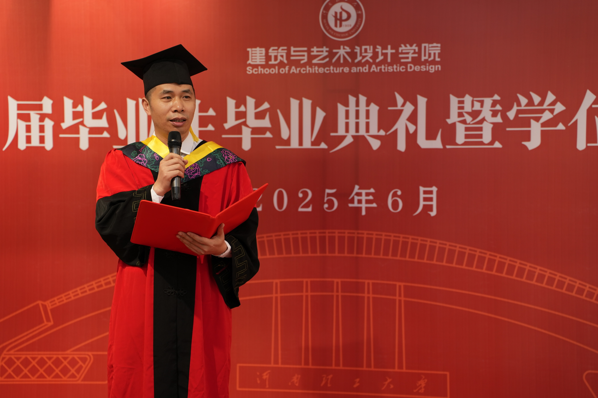 典礼在悠扬的校歌中拉开帷幕。王同文首先代表学院全体师生向圆满完成学业的2025届毕业生致以最热烈的祝贺。他在致辞中深情回顾了毕业生们在学院度过的宝贵时光,充分肯定了他们在专业学习、创新实践和校园活动中取得的优异成绩。他强调,在国家推动高质量发展、强化文化自信与城乡建设品质提升的关键时期,学院学子肩负着塑造人居环境、传承创新文化的重要使命。他勉励全体毕业生要守住初心,心里有梦,将严谨求实、精益求精的专业精神融入未来每一项设计,脚踏实地每一步,以智慧和创意服务社会发展,修炼内心,守住底线,铭记“明德任责”校训和“好学力行”校风,在广阔天地中书写无愧于时代的青春华章。