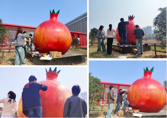 绘制完成的石榴雕塑将作为一处独特的校园文化景观,持续向师生传递团结、和谐、奋进的价值观。视觉传达2503班通过此次深度融合专业实践、主题教育与劳动教育的活动,为大学生涯描绘了精彩的开篇,也为春日校园增添了一抹亮丽而温暖的艺术色彩。