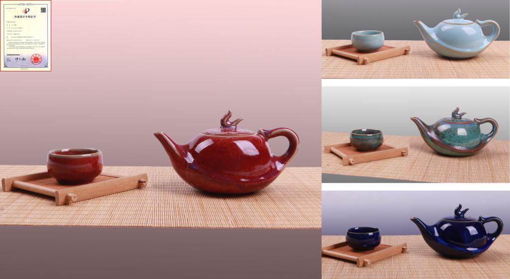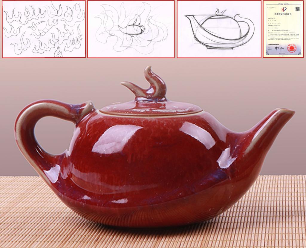 该壶选用钧瓷这一富有中原文化底蕴的陶瓷形式进行产品具象表达。钧瓷作为国家级重点非物质文化遗产,以其神奇的窑变艺术和深厚的文化积淀闻名于世,钧瓷茶壶作为中国瓷文化与茶文化相结合的产物,集聚中国传统文化之美,体现着中国文化特有的品味和情趣。该作品由我院工业设计系教师于向涛带领团队进行设计创作,从2018年起开始构思,数次修改完善设计图纸,多次奔赴学院创新实践基地锦丰源瓷业有限公司与一线工匠师傅潜心求教器形特点,反复烧制定型,“明德壶”最终圆满烧制成功。